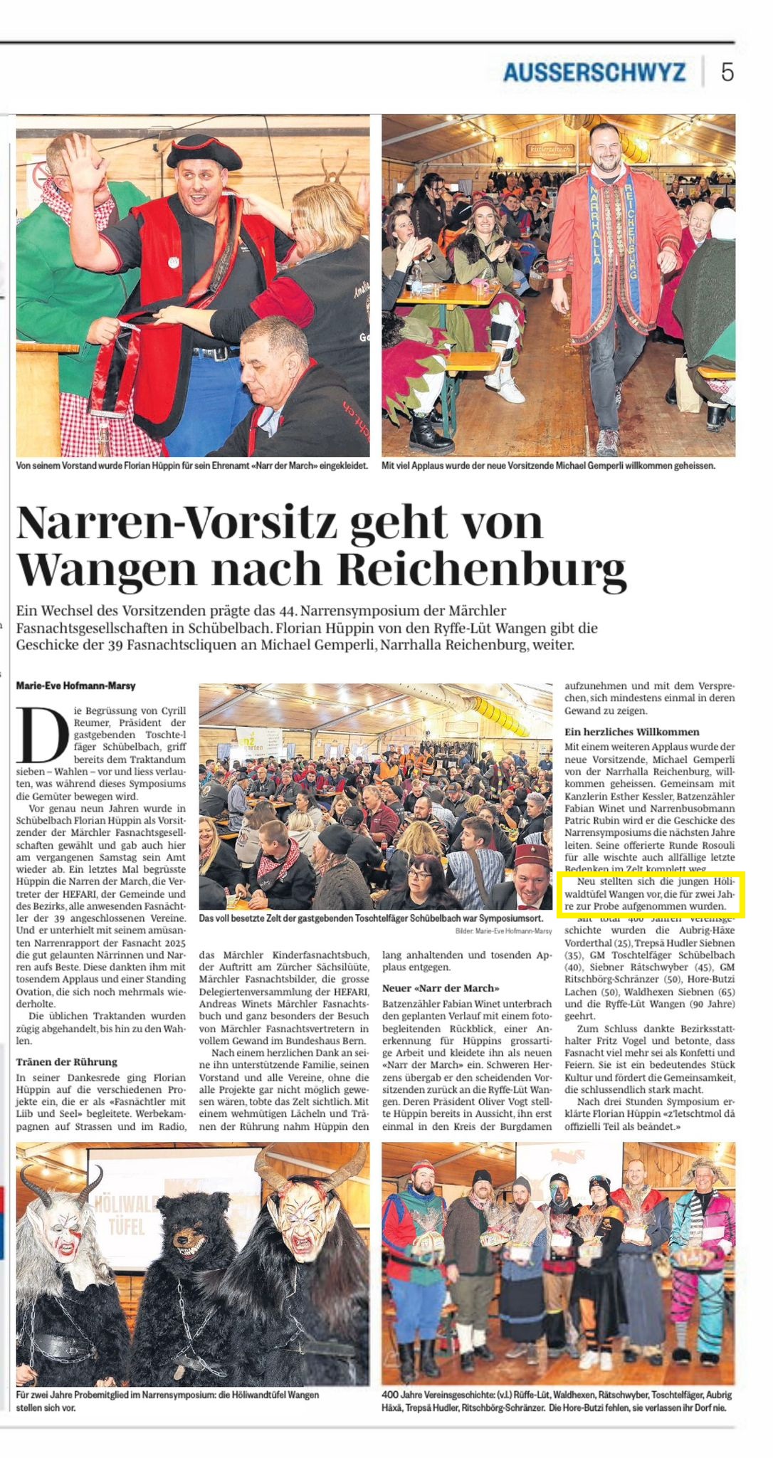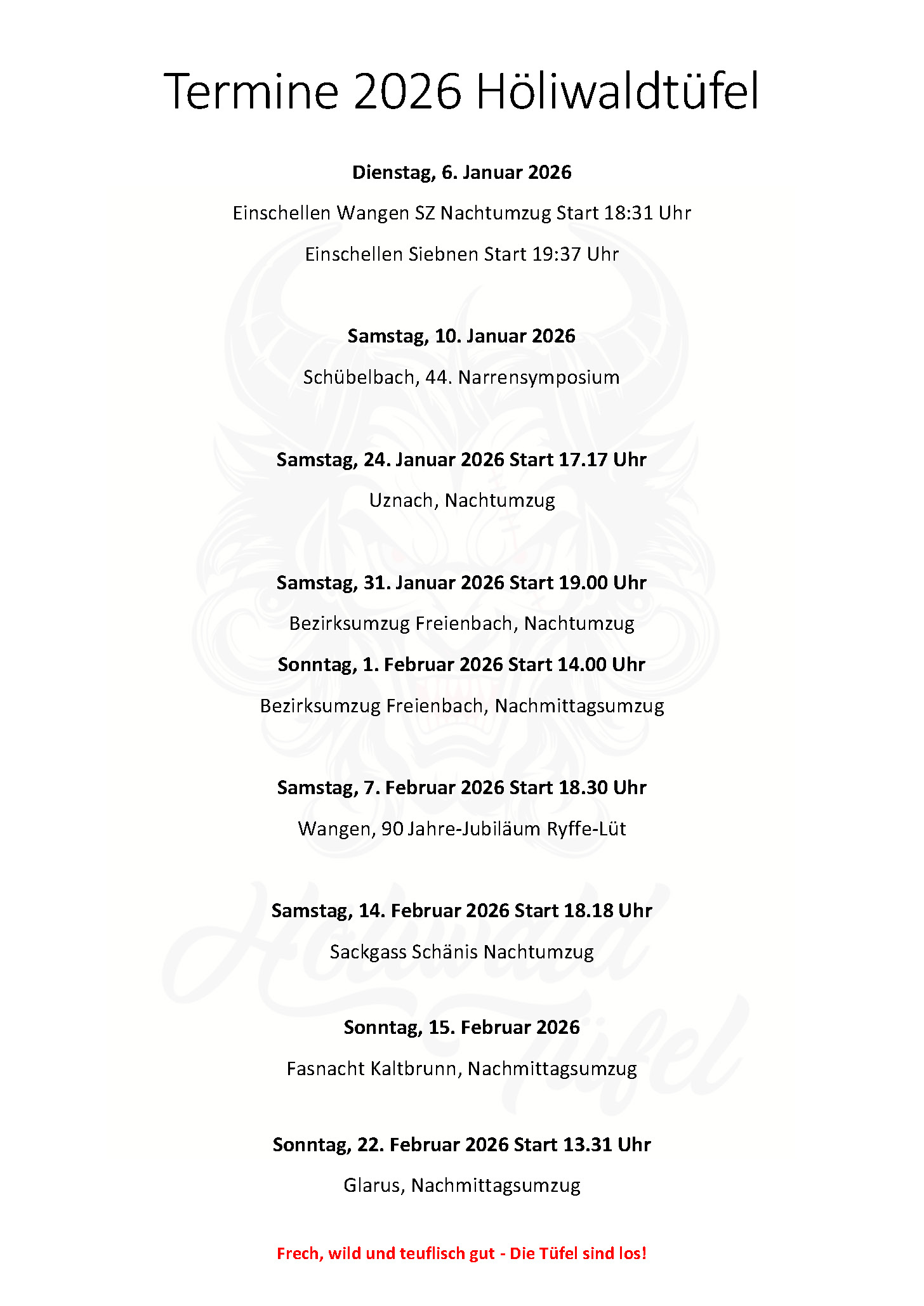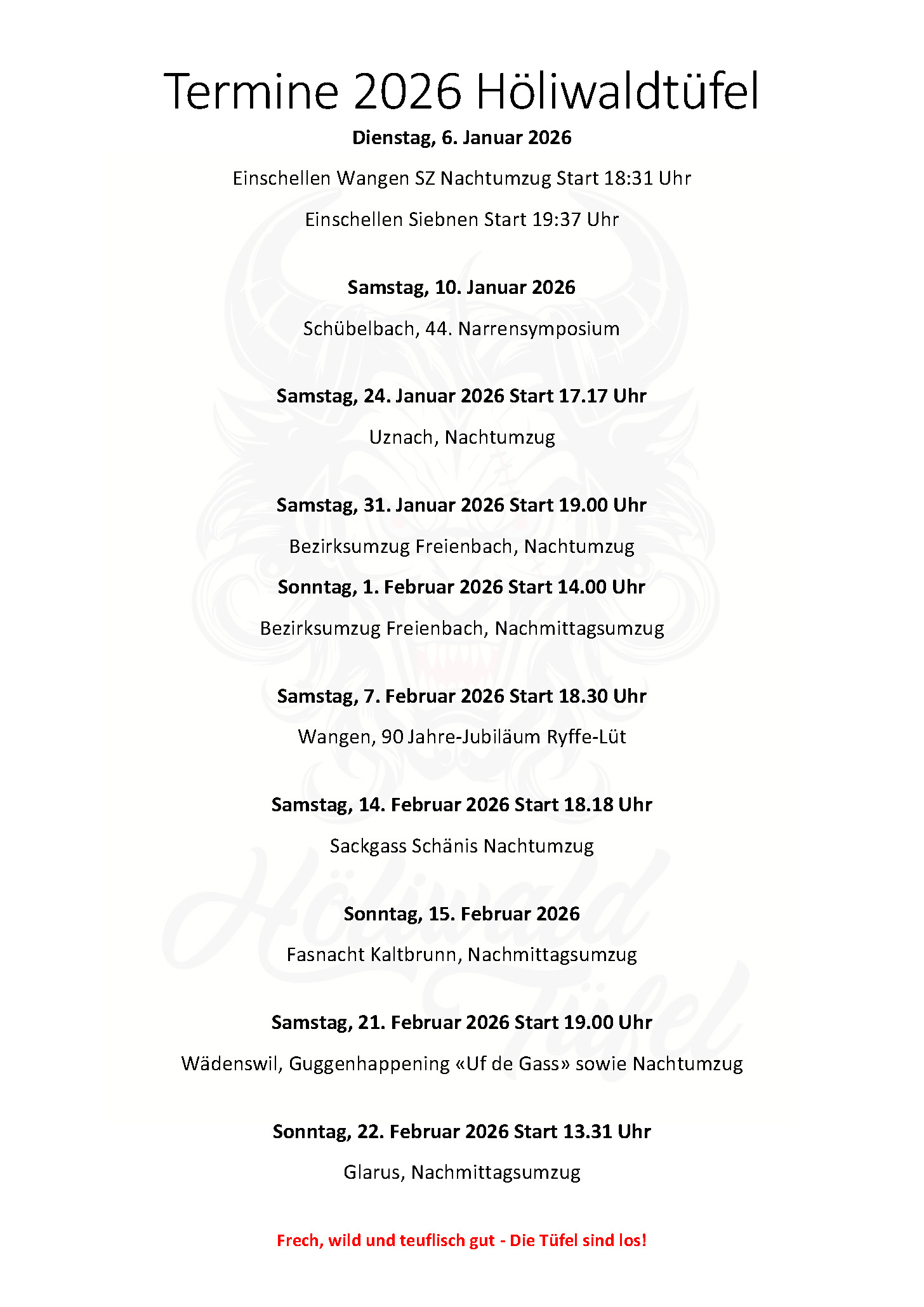 Wir sind eine neu gegründete Fasnachtsgruppe aus dem Höliwald in Wangen und freuen uns über Zuwachs! Unter dem Motto „Frech, wild und teuflisch gut“ ziehen wir gemeinsam durch die Fasnacht und leben unsere Kreativität und unseren Spass am närrischen Treiben aus. Wenn du Lust auf eine wilde Truppe hast und Teil unseres Abenteuers werden möchtest, bist du bei uns genau richtig! Egal ob Neuling oder Fasnachtsprofi – bei uns ist jeder willkommen!